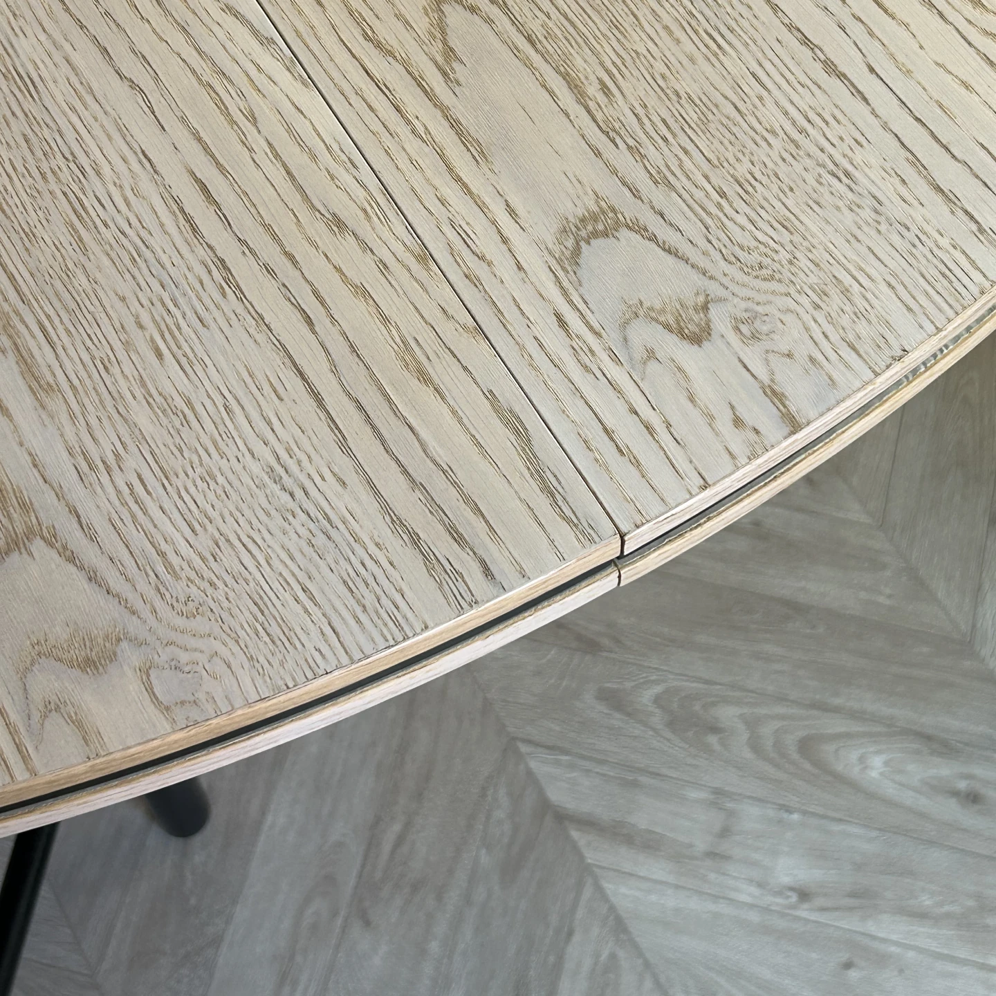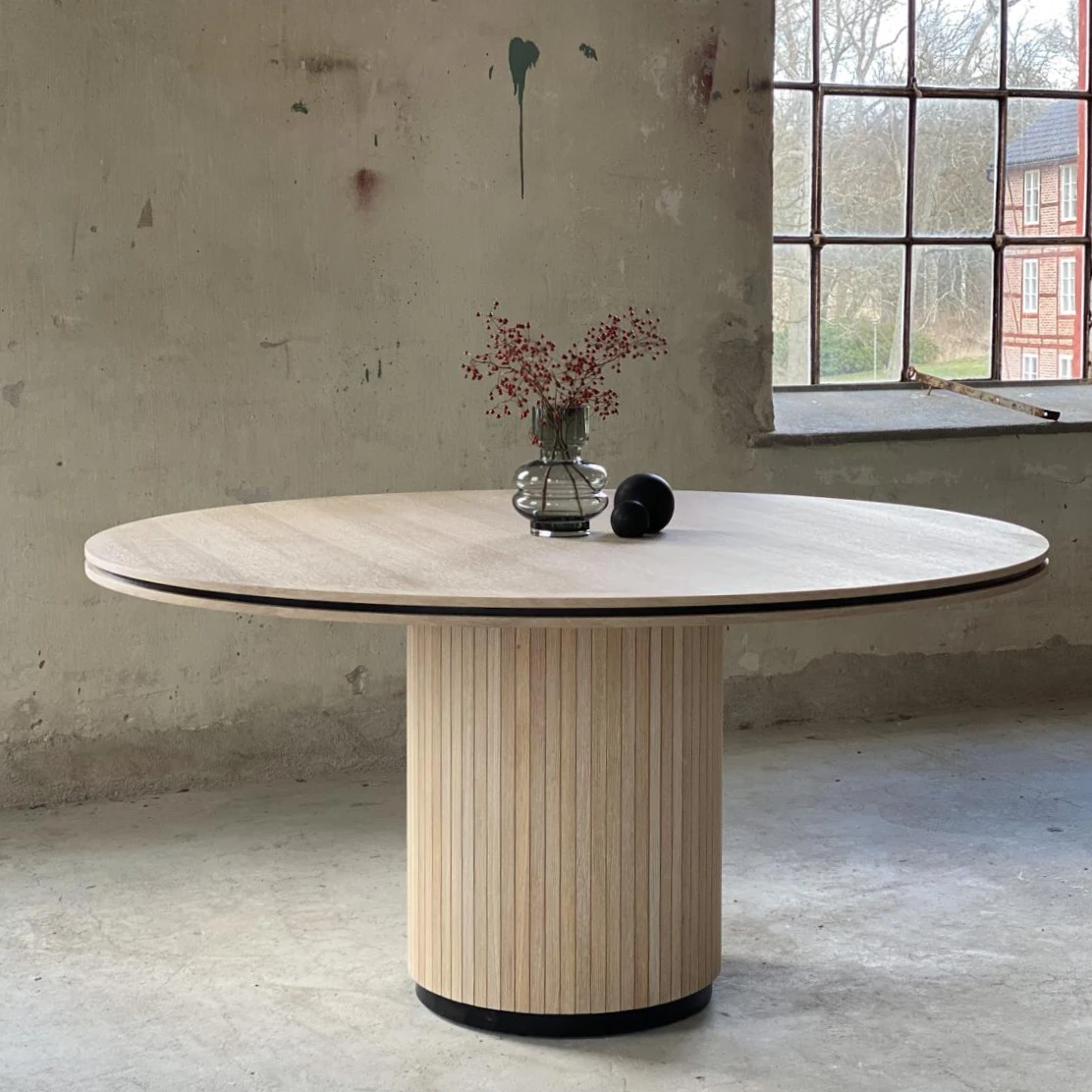 Den runda formen skapar en inbjudande känsla, medan den vaxade ekfaneren ger bordet en varm, naturlig karaktär.