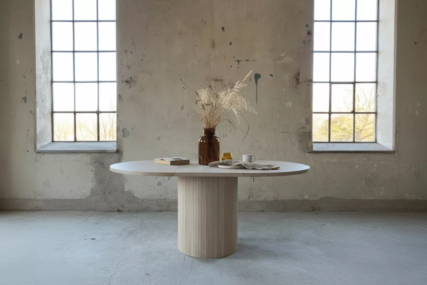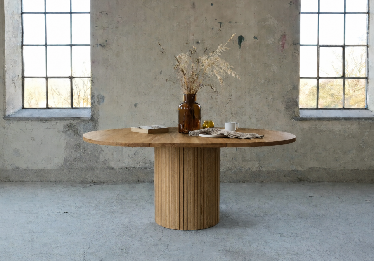 Circle Matbord i massiv ek är utformat i skandinavisk design för att passa både moderna och klassiska inredningar. Den runda formen skapar en inbjudande atmosfär där alla kan samlas och njuta av måltider tillsammans. Med sin eleganta och minimalistiska design blir detta bord en naturlig mittpunkt i ditt hem. Den delbara bordsskivan gör bordet förlängningsbart med upp till 3 iläggsskivor. Bordsskivan stöds av en ribbad pelare som ger designen karaktär.