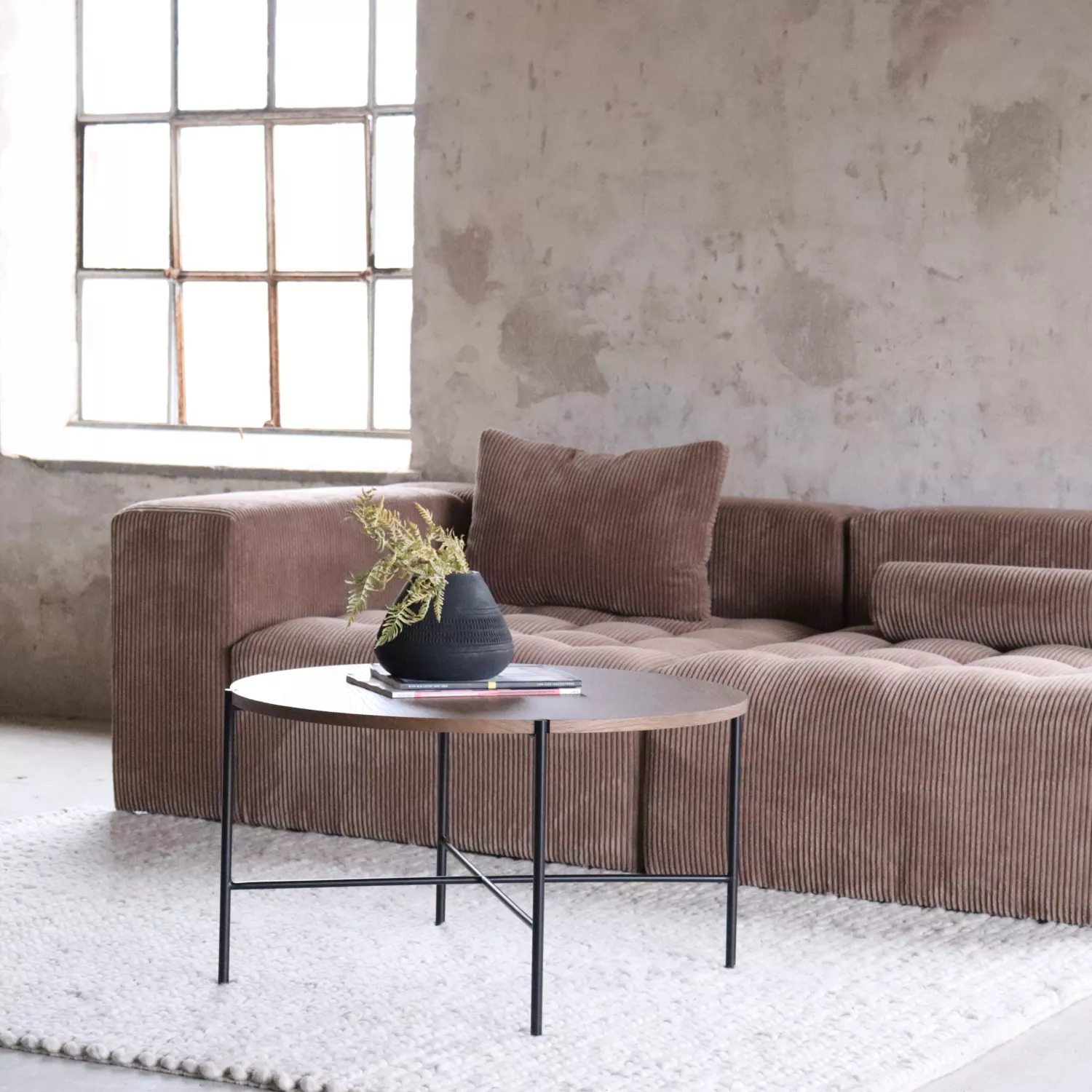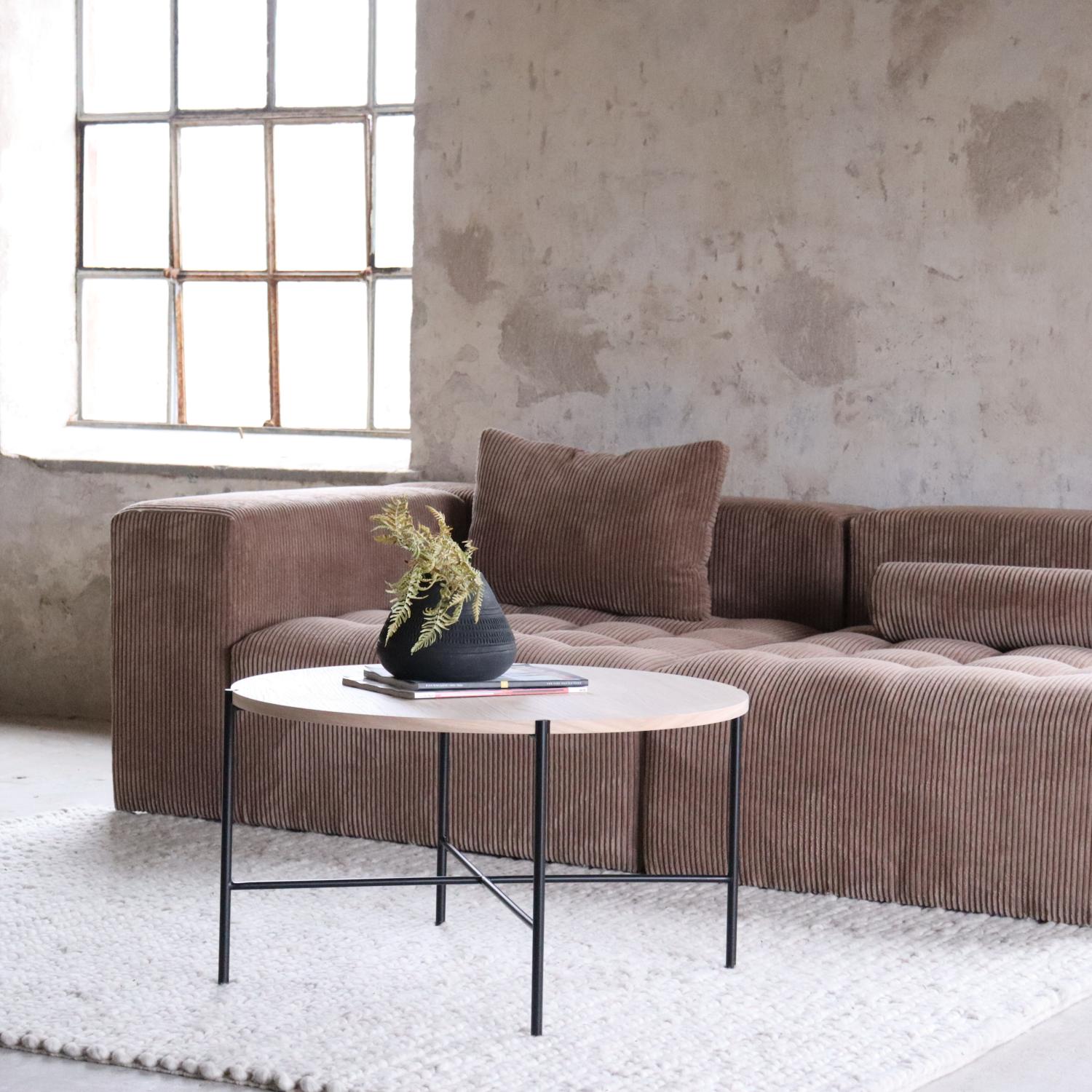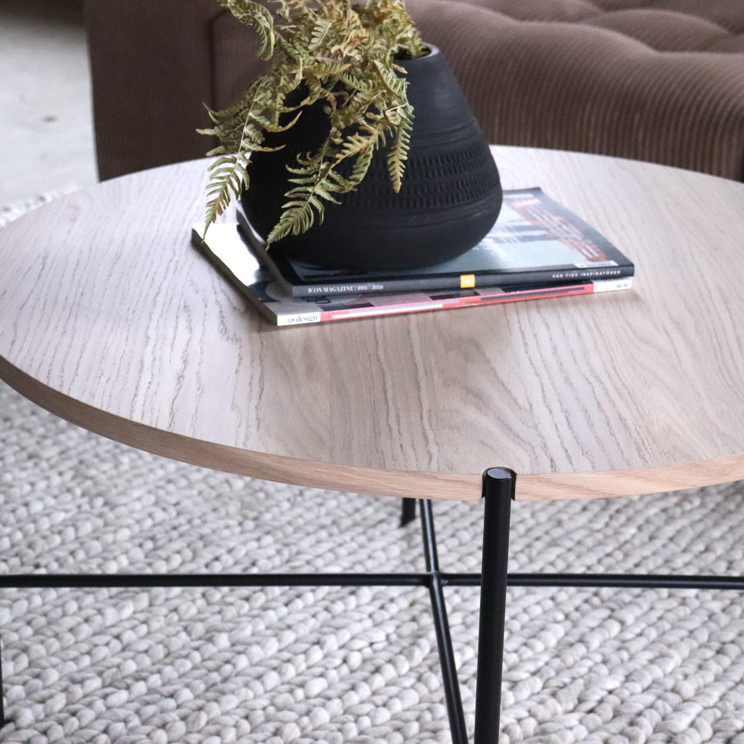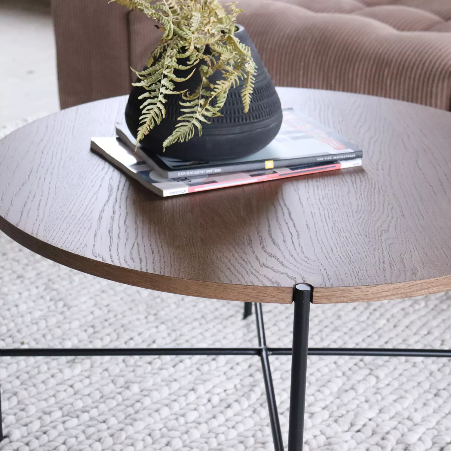 Upptäck Broby, soffbordet som kombinerar det varma och naturliga i ekfaner med den moderna touchen av metallben.