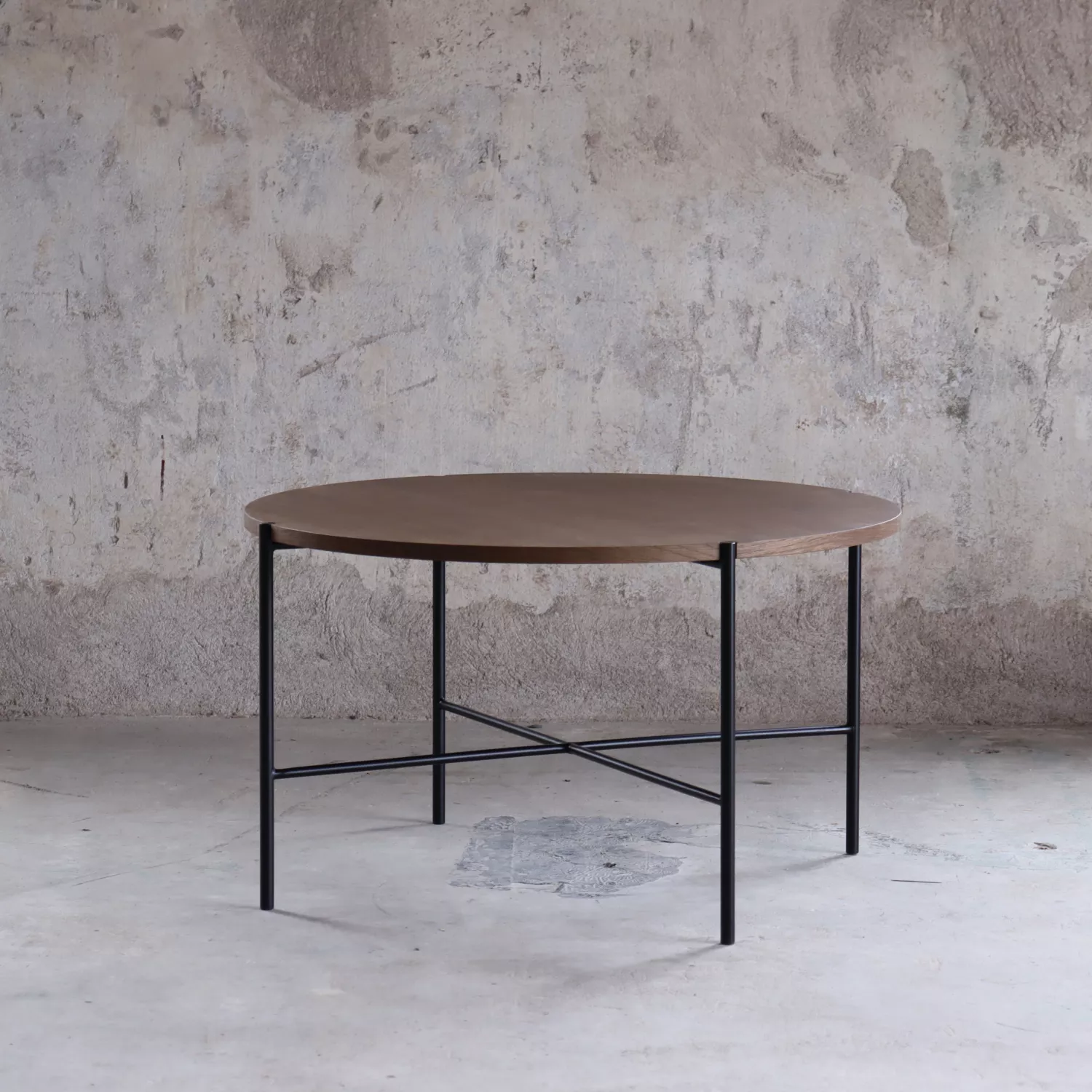 Den vackra skivan i ekfaner ger en mjuk, jordnära känsla, medan de eleganta metallbenen skapar ett stiligt kontrast och ger bordet en modern karaktär.
